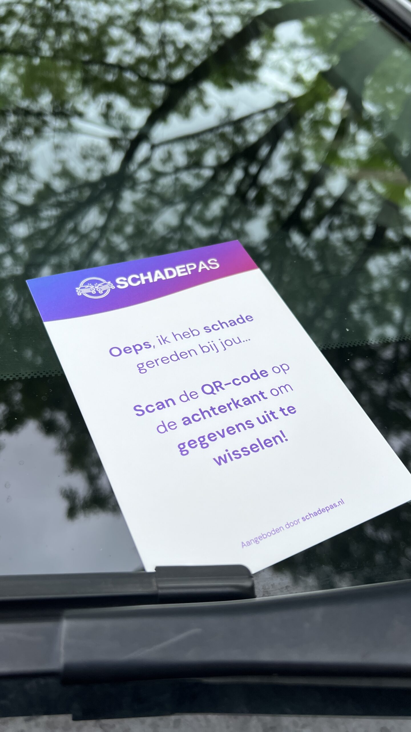 Plaats de Schadepas onder de ruitenwisser van het beschadigde voertuig. De tegenpartij scant de QR-code en krijgt direct toegang tot jouw ingevulde gegevens, zoals naam, telefoonnummer en eventueel foto’s. Zo kunnen beide partijen snel en correct de schade afhandelen – zonder onnodige stress of onduidelijkheid.