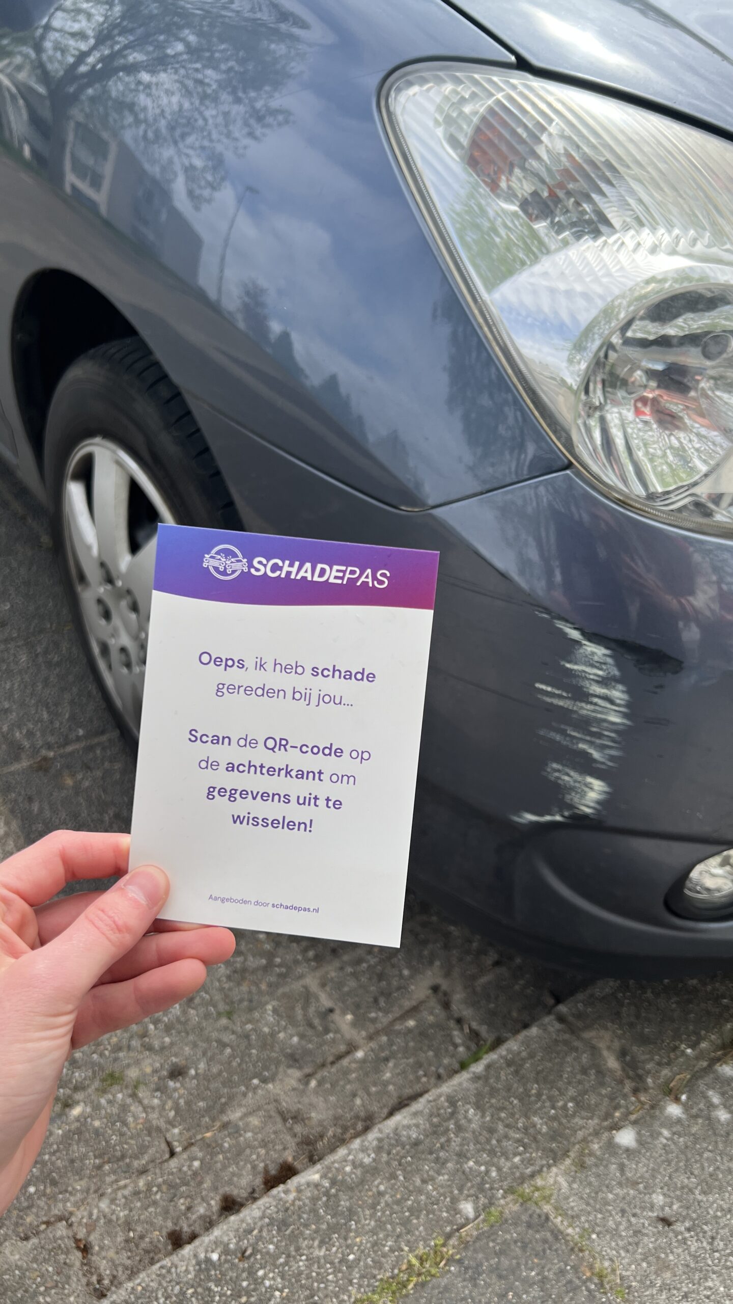 Schadepas is dé oplossing voor situaties waarin je schade aan een geparkeerd voertuig veroorzaakt, maar de eigenaar niet aanwezig is. Met deze fysieke kaart, voorzien van een unieke QR-code, laat je eenvoudig en veilig jouw contactgegevens achter.