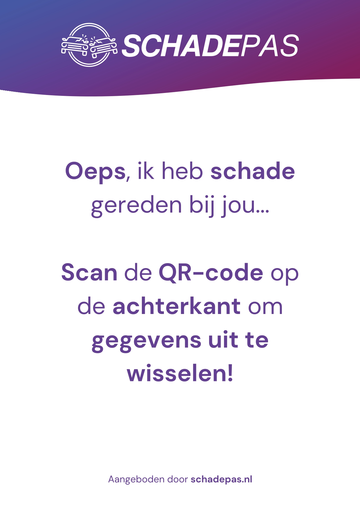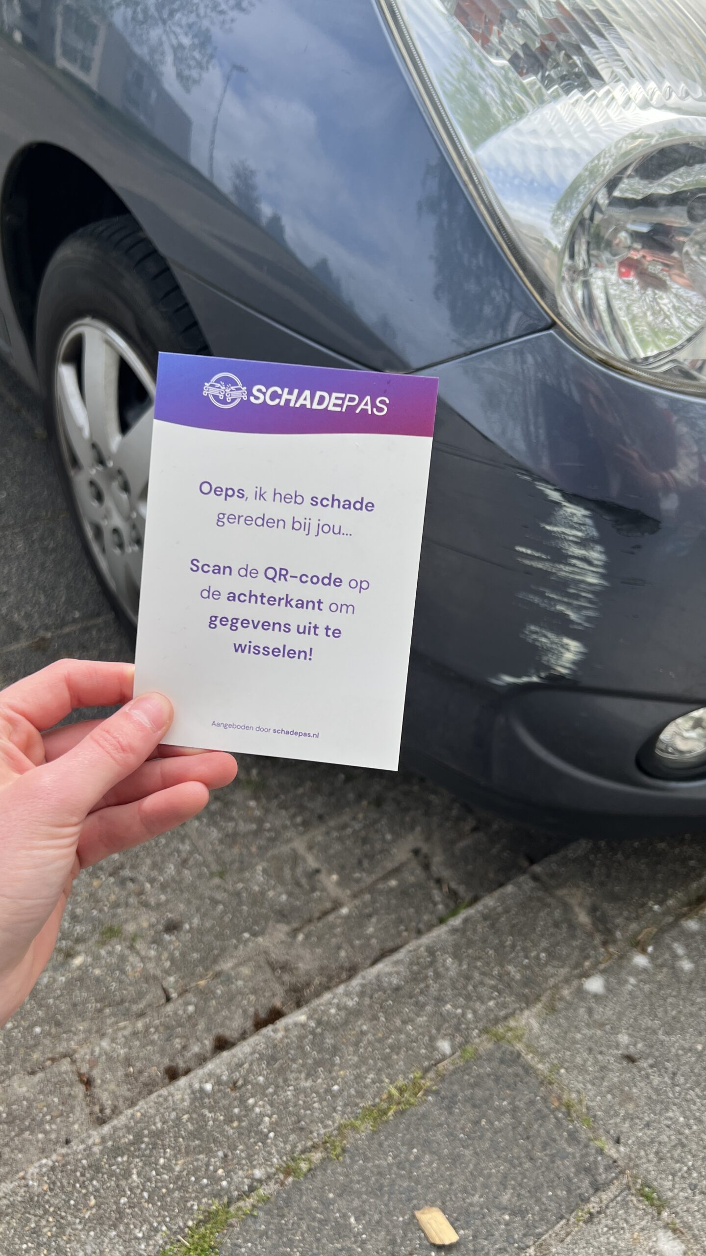 Schadepas is dé oplossing voor situaties waarin je schade aan een geparkeerd voertuig veroorzaakt, maar de eigenaar niet aanwezig is. Met deze fysieke kaart, voorzien van een unieke QR-code, laat je eenvoudig en veilig jouw contactgegevens achter.