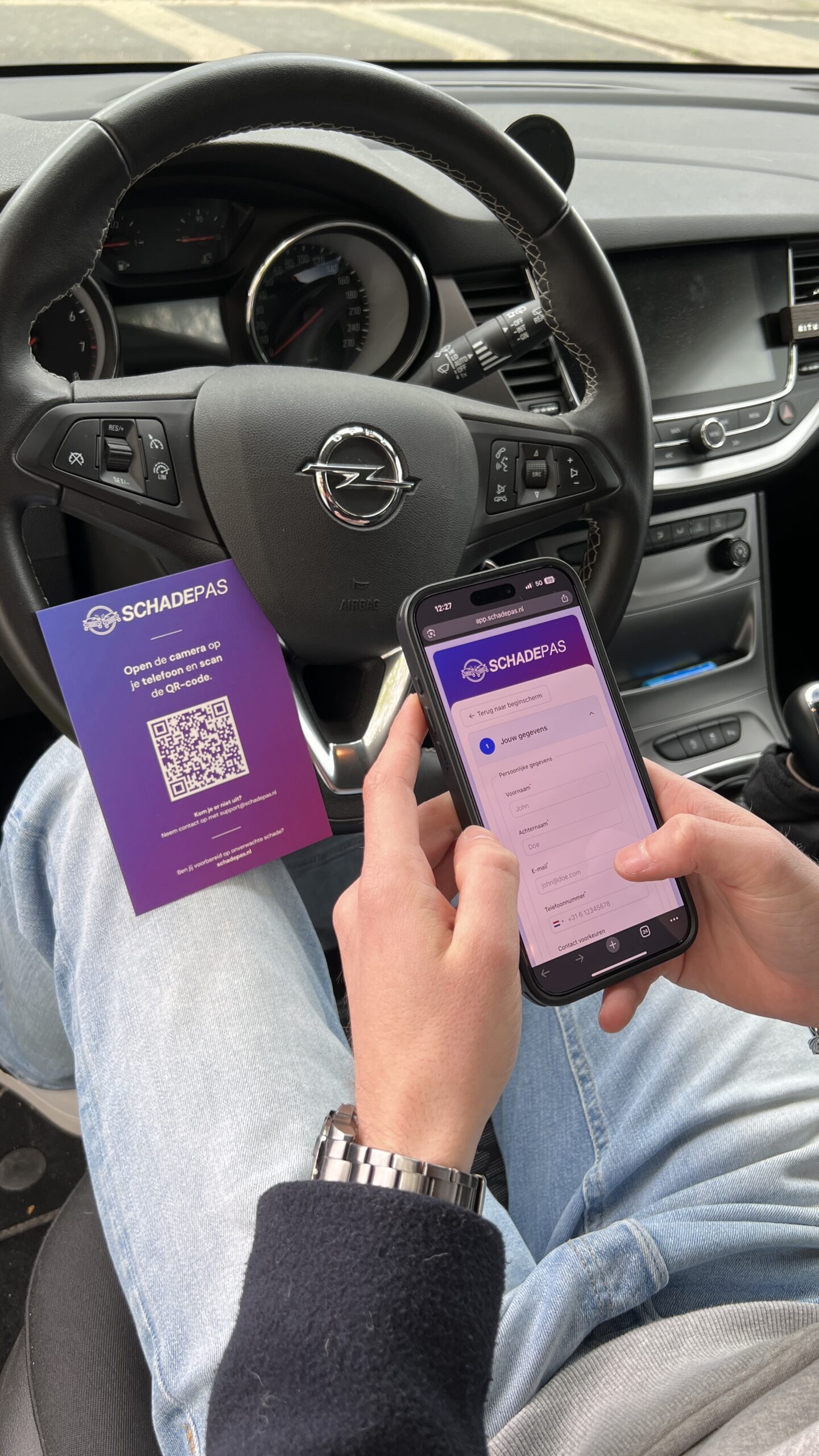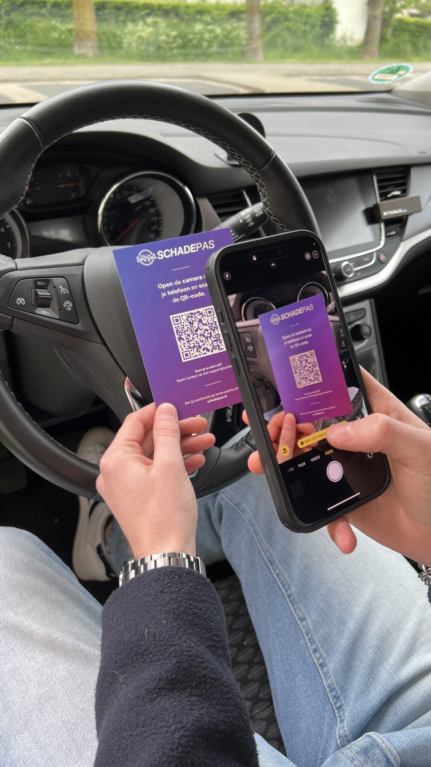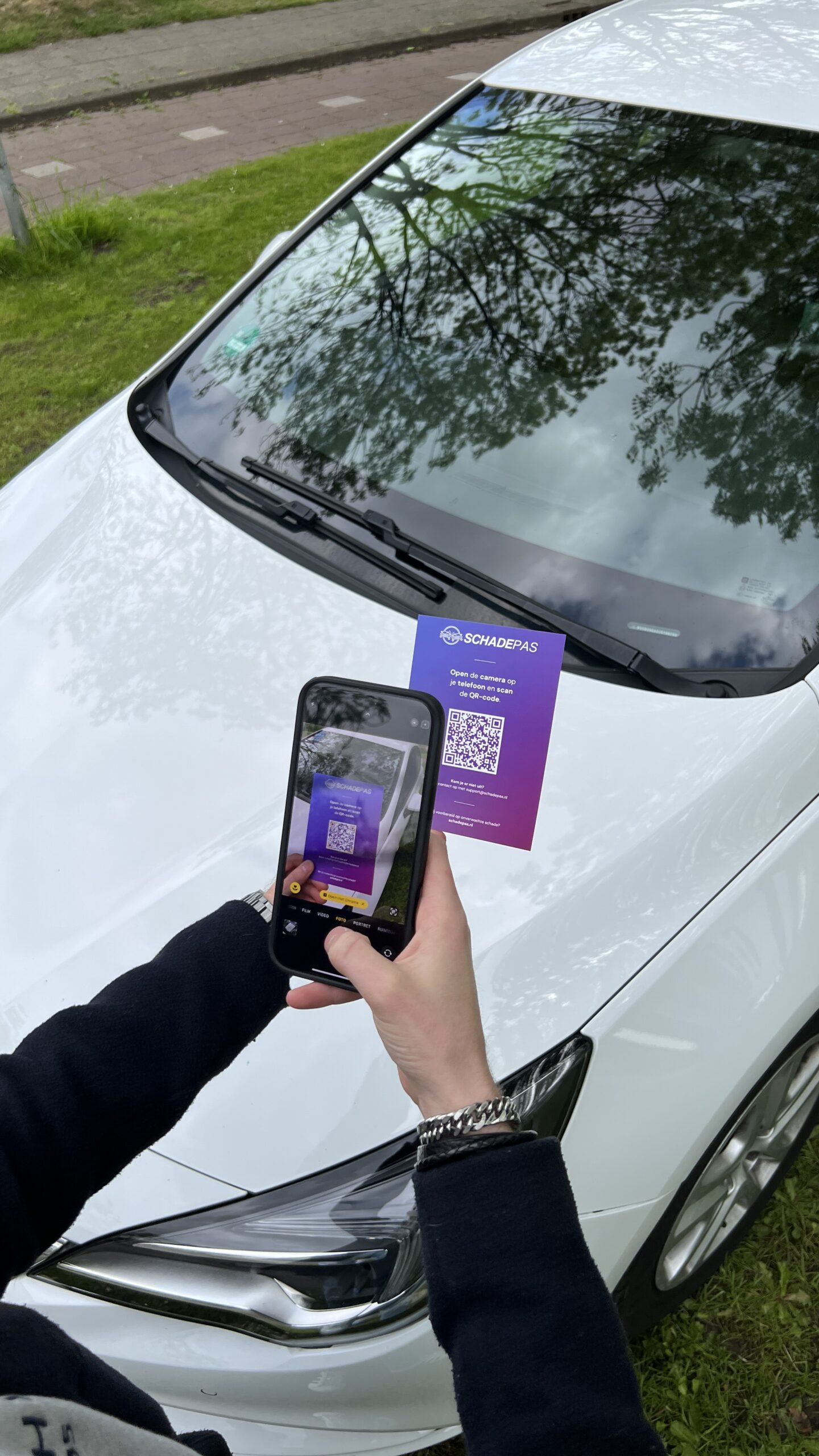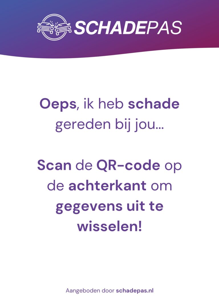 Plaats de Schadepas onder de ruitenwisser van het beschadigde voertuig. De tegenpartij scant de QR-code en krijgt direct toegang tot jouw ingevulde gegevens, zoals naam, telefoonnummer en eventueel foto’s. Zo kunnen beide partijen snel en correct de schade afhandelen – zonder onnodige stress of onduidelijkheid.